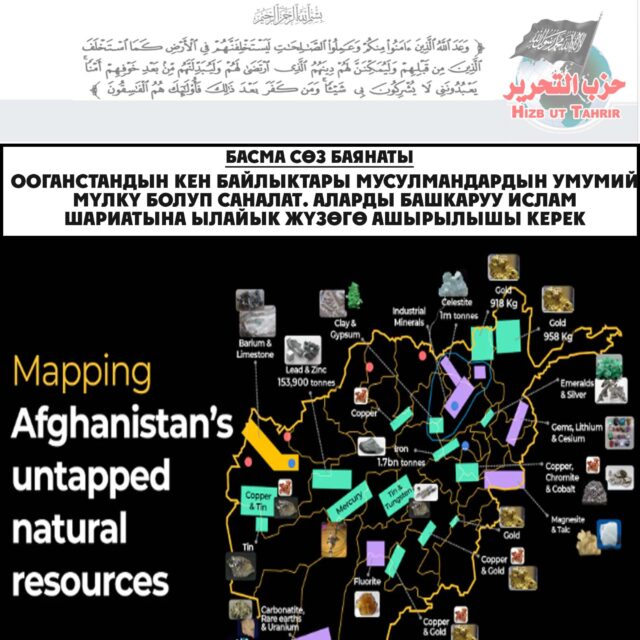 Ооганстандын кен байлыктары мусулмандардын умумий мүлкү болуп саналат. Аларды башкаруу Ислам шариатына ылайык жүзөгө ашырылышы керек, саясий же жеке кызыкчылыктарга жараша эмес!