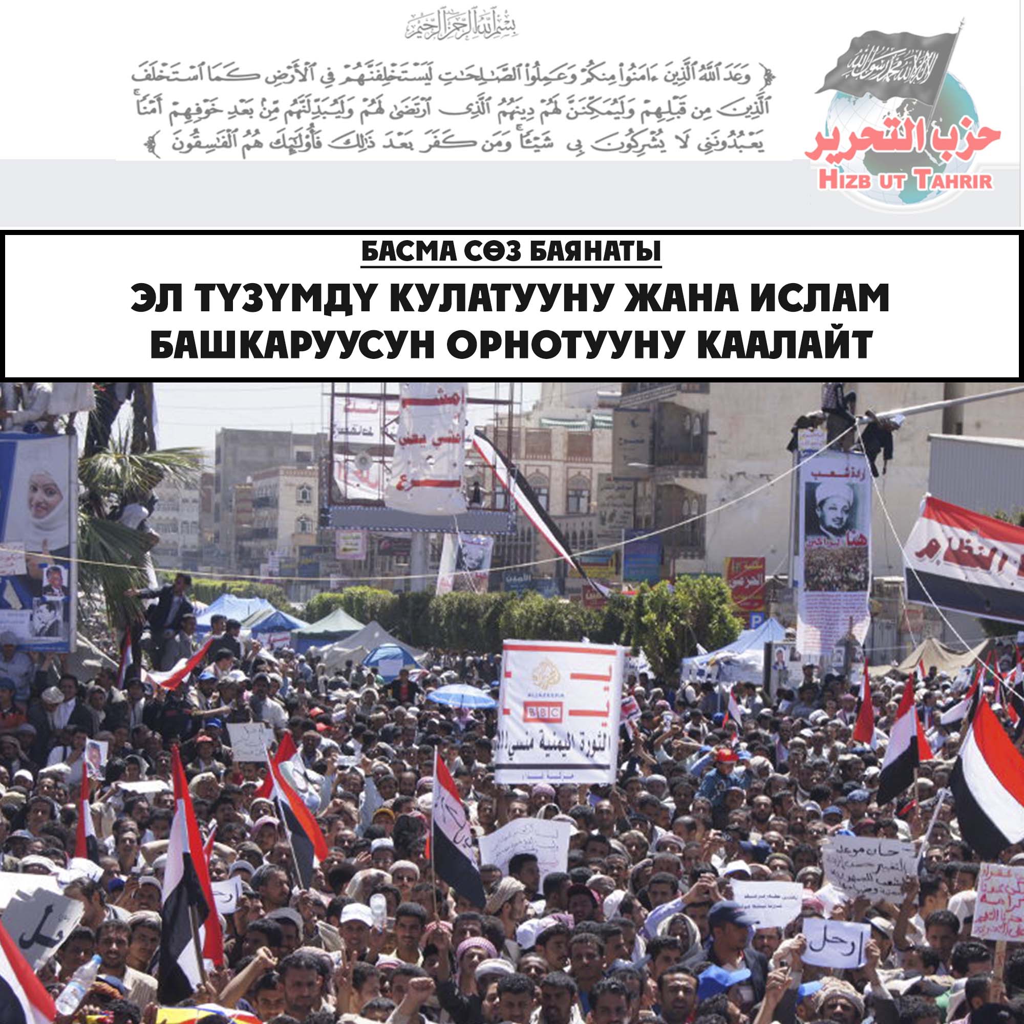 Бүгүнкү күндө Йемендеги башкаруу системасына каршы көтөрүлүштүн себептери 2011-жылкы революциядагы себептерден да көбүрөөк. Элдин жашоо шарты бир топ оорлоп, зулум жана кан төгүү токтогон жок. Ал эми Аллахтын түшүргөн өкүмдөрү менен башкаруу болсо али токтотулган абалда турат. Ошондуктан элдин: “Түзүм өзгөргөн жок” деп түшүнүүсү толук табигый нерсе. Республикачыл секулярдык система дагы эле ордунда турат. Ошондуктан, биз кайрадан “Эл түзүмдү кулатууну каалайт” деген ураанга кайтышыбыз керек. Бирок бул жолу сөзсүз түрдө ийгиликтүү жана чынчыл бир альтернатива долбоору болушу шарт. Болбосо, буга чейин кеткен эмгек, курмандык жана кан кайра текке кетип, революциялар бурулуп, дал ушул азыркыдай коркунучтуу абалга алып келгендей батыш куфруна кызмат кылган бир ууч агенттер тарабынан кайра пайдаланылып кетүү коркунучу бар. Ошондуктан биз түшүндүрүп беришибиз керек. Эмне үчүн 2011-жылы башталган Араб Жазы революциялары элдин абалын өзгөртө алган жок, тескерисинче, мындан да начарлатып жиберди? Мунун эң негизги себеби батыштагы куфр мамлекеттер өз агенттери аркылуу бул революцияларды уурдап, багытын өзгөртүштү. Алар ак ниет, аң-сезимдүү адамдарды четтетишти жана эл көтөрүлгөн режимдерди башка эшик аркылуу, бирок бул жолу дагы жаман жана зулум кейипте кайра кайтарып келишти. Бул менен алар эки максатка жетүүнү көздөшкөн: