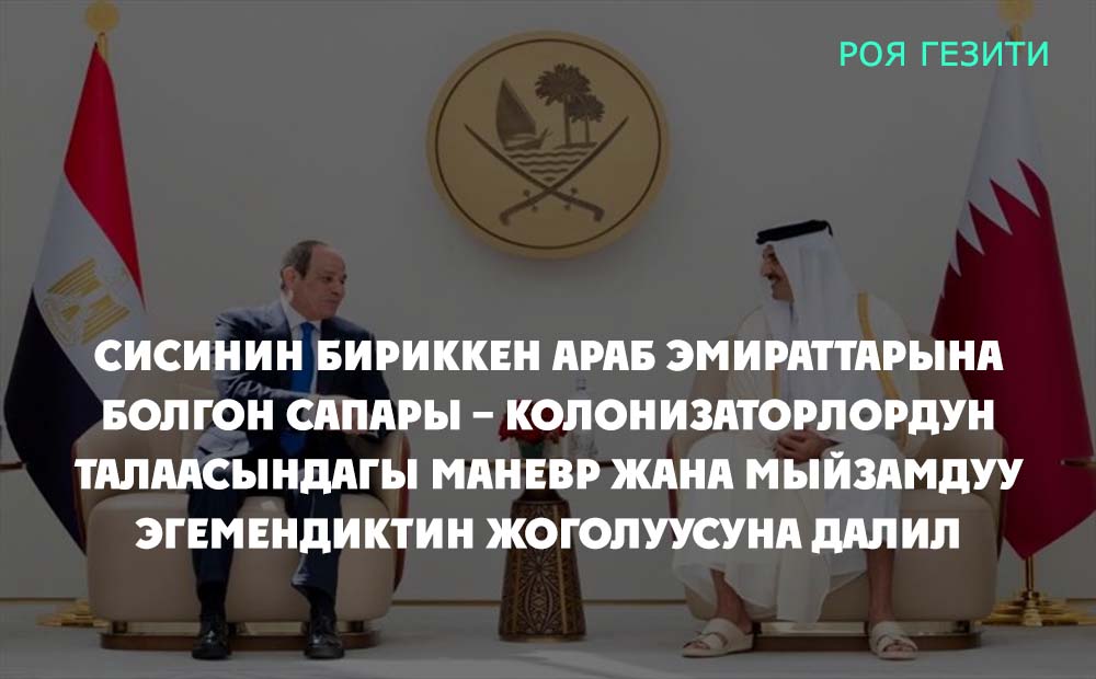 Мисир президенти Сисинин 2025-жылдын 4-июнунда (шаршемби күнү) Абу-Дабиге болгон сапары күтүүсүз дипломатиялык кадам эмес. Бул сапар аймактагы таасир үчүн жарыша аракет кылып жаткан колонизатор тыңчыларынын ортосундагы катуу атаандаштык алкагында орун алды. Алар өздөрүнө баш ийген режимдерди өздөрүнүн пландарын ишке ашыруу үчүн колдонуп жатышат. Бул алдын ала жарыяланбаган сапар Иран тышкы иштер министри Аббас Иракижинин Каирге болгон сапарына түз жооп болду. Бул көрүнүш азыркы режимдердин кылмыштары толук ачылып калганын жана батыш колонизатор күчтөрүнө толук көз каранды экенин чагылдырат.